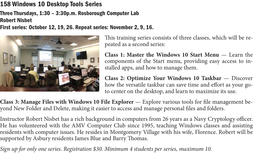_____ Three Thursdays 1:30 to 3:30 pm, First series: October 12, 19, 26. Repeat series: November 2, 9, 16, Rosborough Computer Lab