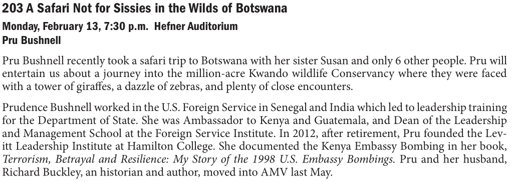 #203, Mon, Feb, 13, A Safari Not For Sissies in the Wilds of Botswana, Pru Bushnell,