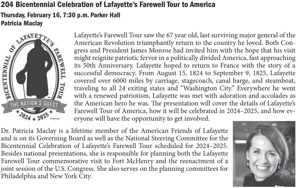#204, Thu, Feb, 16, Bicentennial Celebration of Lafayette's Farewell Tour to America, Patricia Maclay,