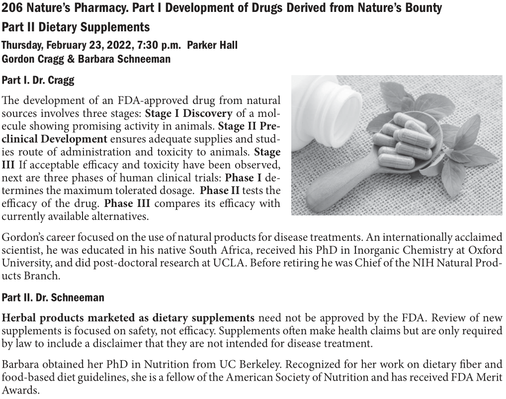 #206, Thu, Feb, 23, Nature's Pharmacy. I. Drugs from Nature, II. Dietary Supplements, Gordon Cragg & Barbara Schneeman,