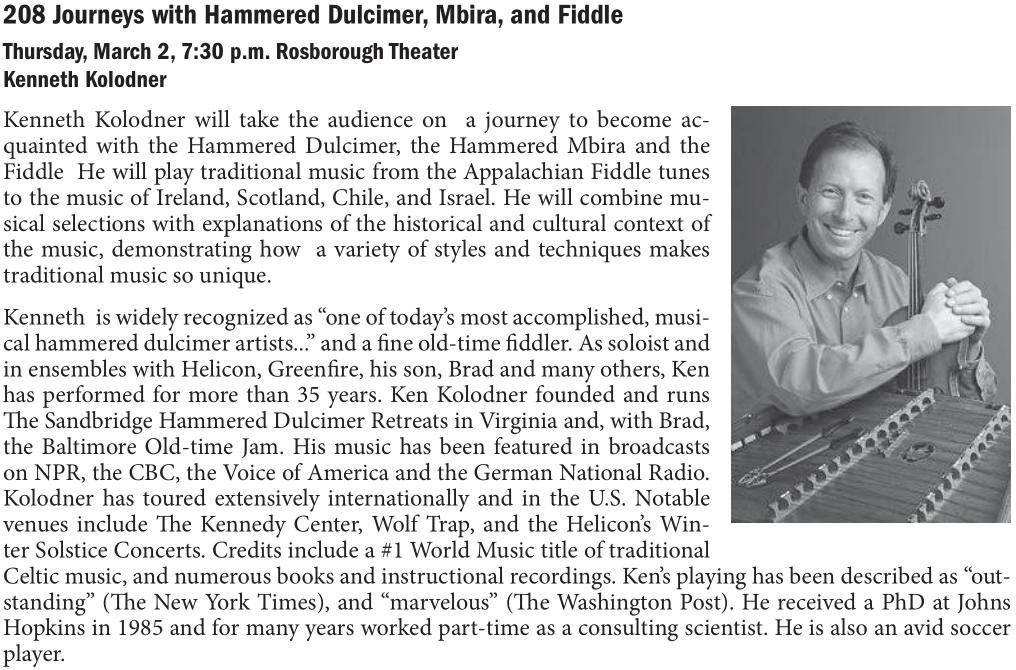 #208, Thu, Mar, 02, Journeys With Hammer Dulcimer, Mbira and Fiddle, Kenneth Kolodner,