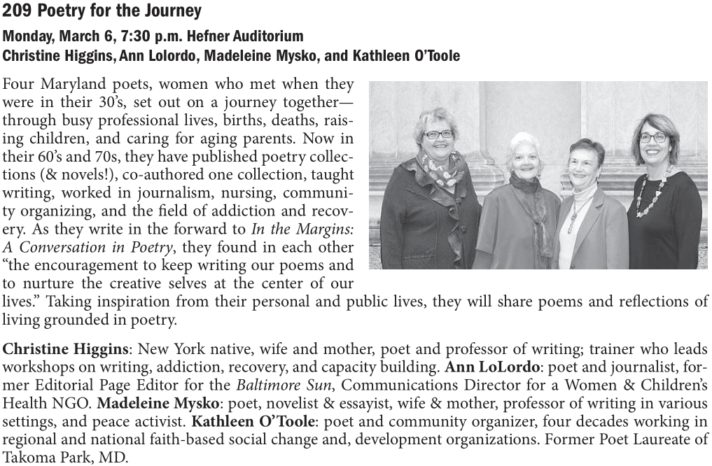 #209, Mon, Mar, 06, Poetry for the Journey, Kathleen O'Toole, Christine Higgins, Ann Lolordo, and Madeleine Mysko,