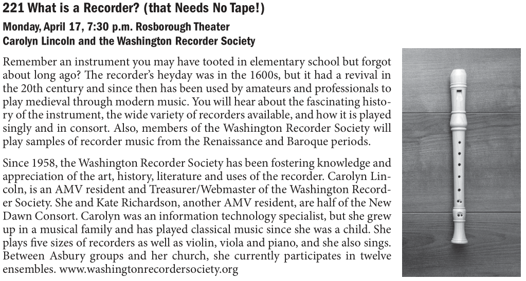 #221, Mon, Apr, 17, What is a Recorder? (that needs no tape!), Carolyn Lincoln and the Washington Recorder Society,