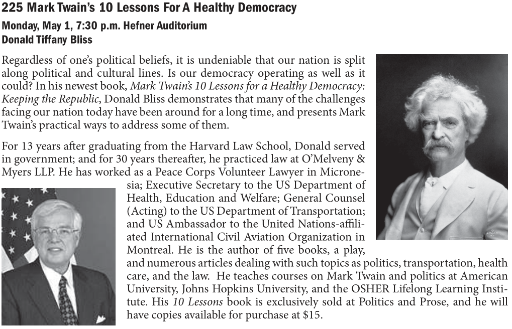 #225, Mon, May, 01, Mark Twain's 10 Lessons For A Healthy Democracy, Donald Tiffany Bliss,