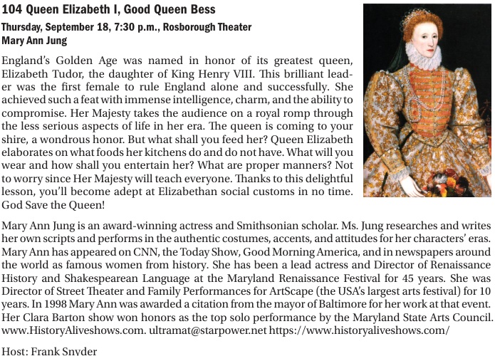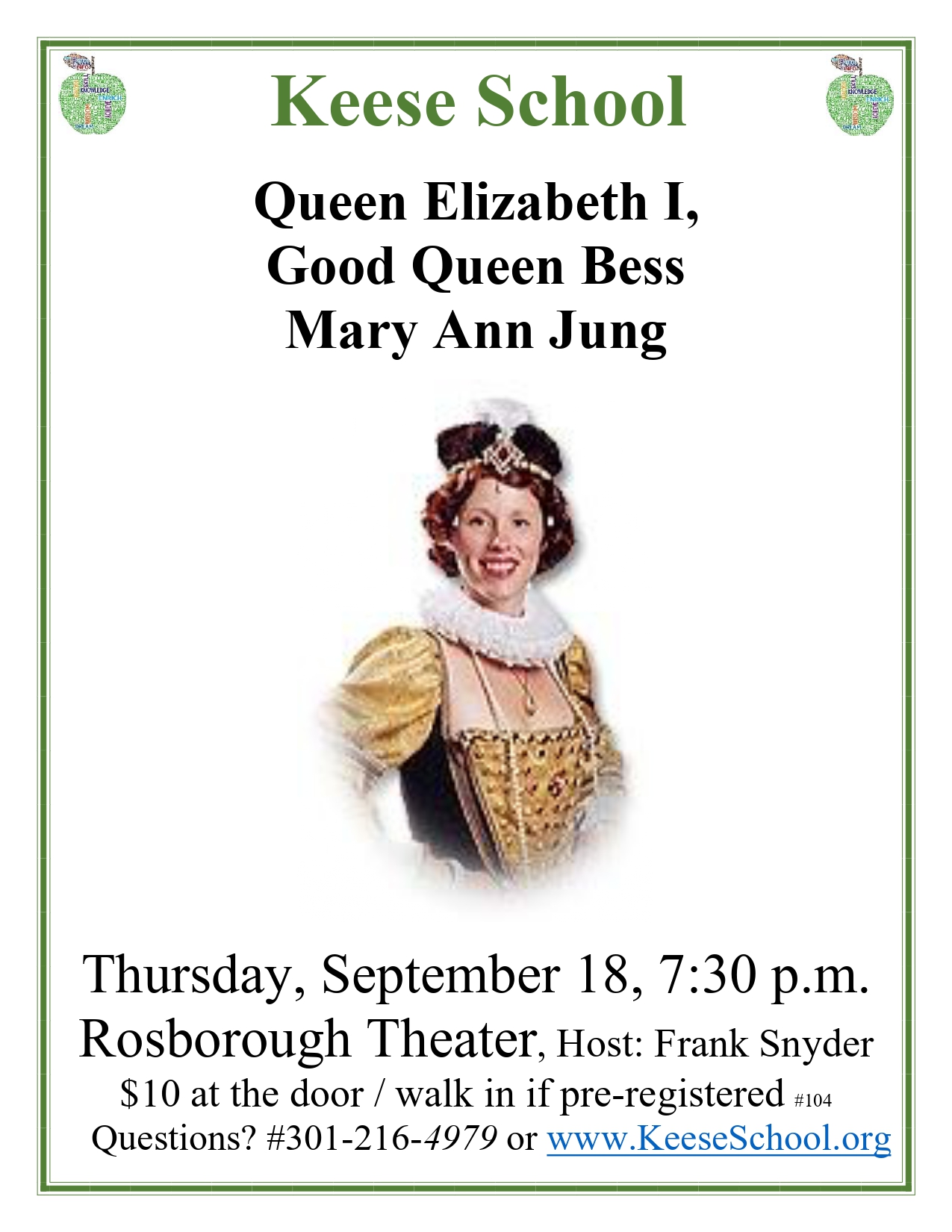 Queen Elizabeth I, Good Queen Bess , Mary Ann Jung, Rosborough Theater,