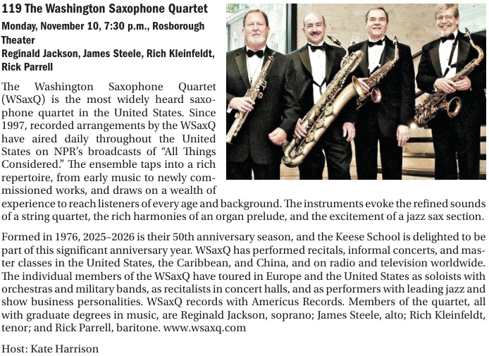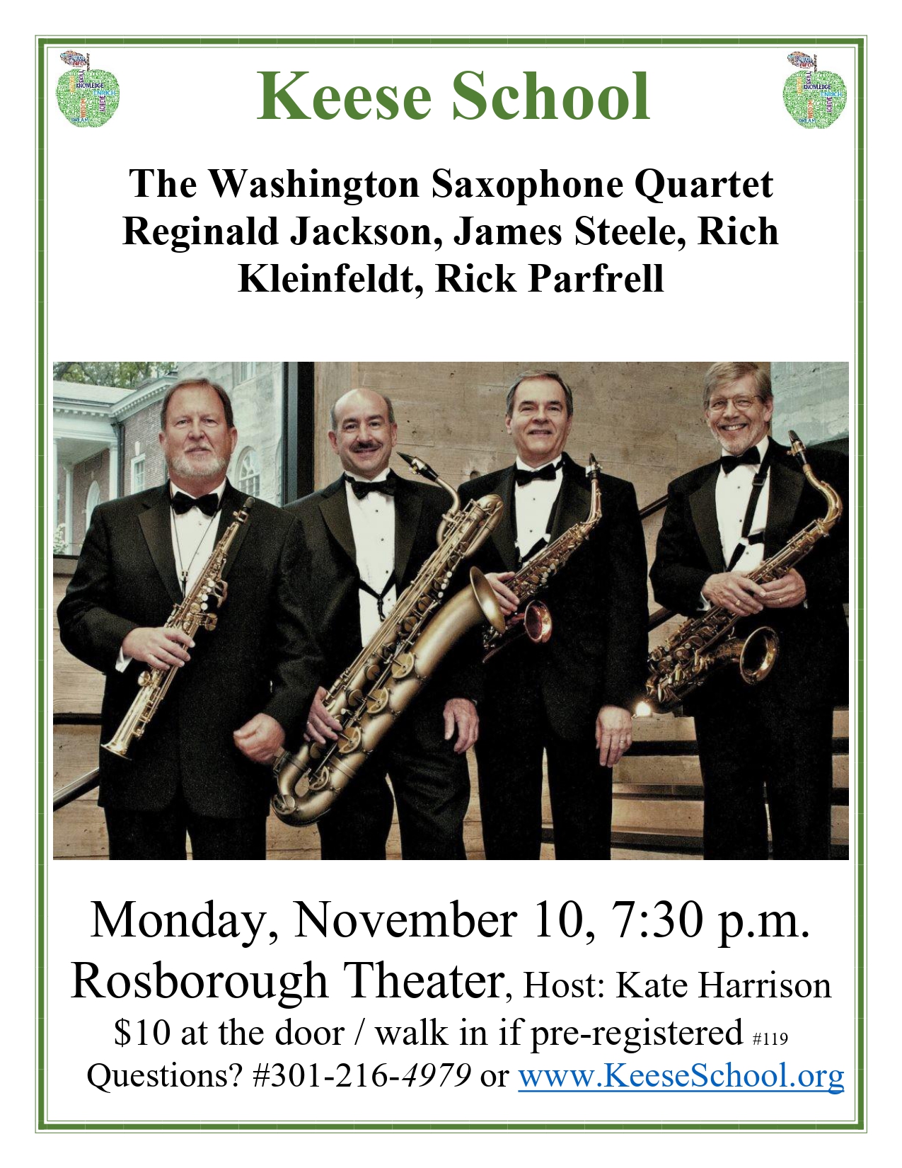 The Washington Saxophone Quartet , Reginald Jackson, James Steele, Rich Kleinfeldt, Rick Parfrell, Rosborough Theater,